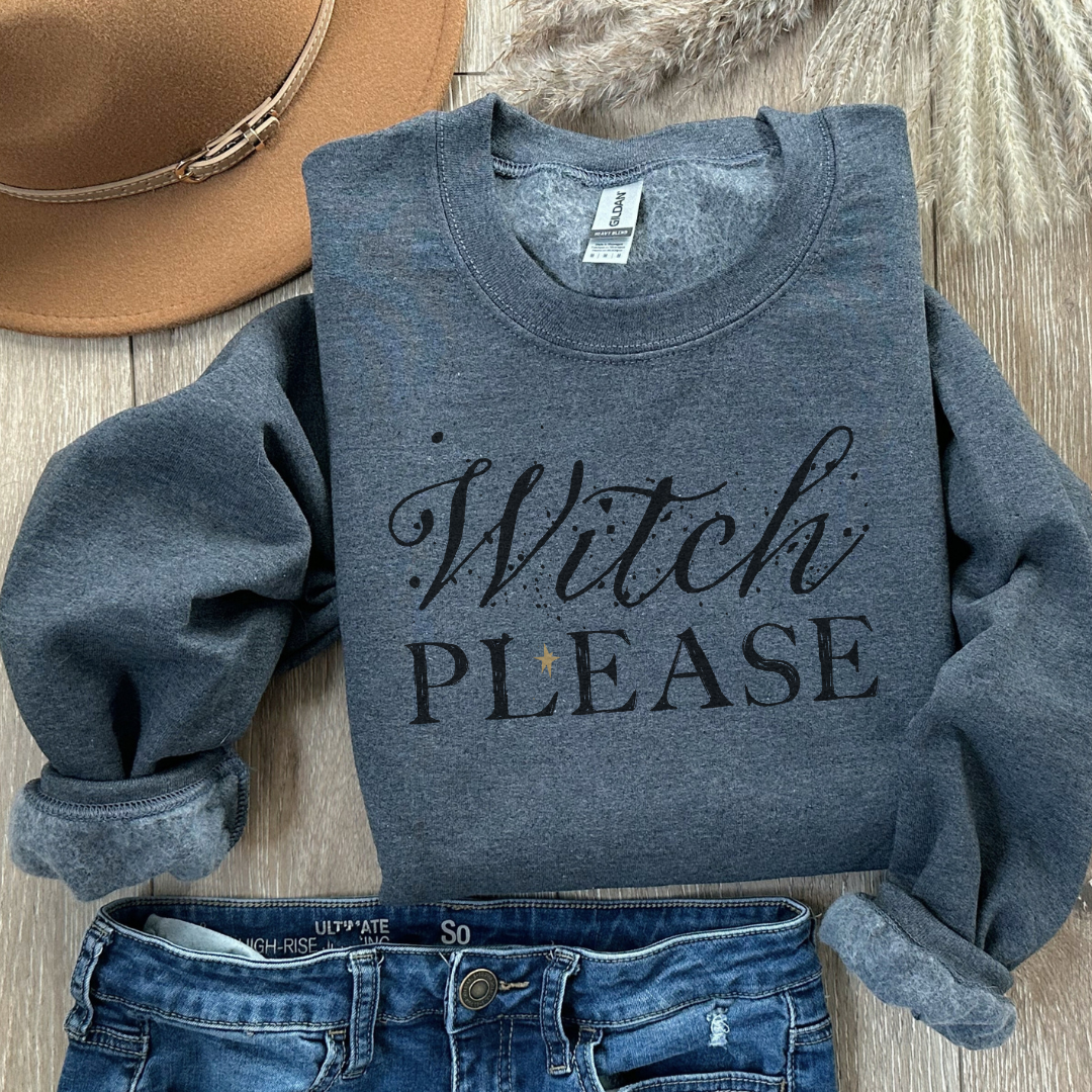 Tongue in cheek phrases embroidered with glossy black threads onto dark heather grey crew neck sweaters make the perfect wardrobe staple for Spooky Season!